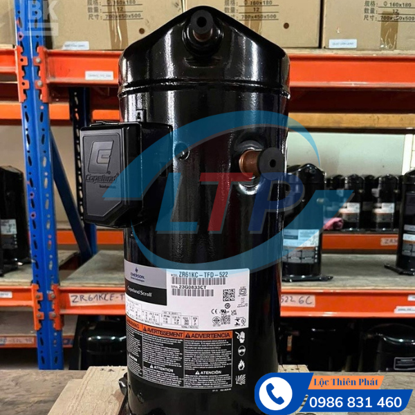 Máy nén lạnh Copeland 5HP – ZR61KC-TFD-522 thuộc dòng Scroll Copeland ZR Series, thiết kế chuyên dụng cho kho lạnh thương mại, kho mát, tủ đông – tủ mát, chiller dân dụng – công nghiệp nhỏ, siêu thị mini và hệ thống HVAC tải trung bình.